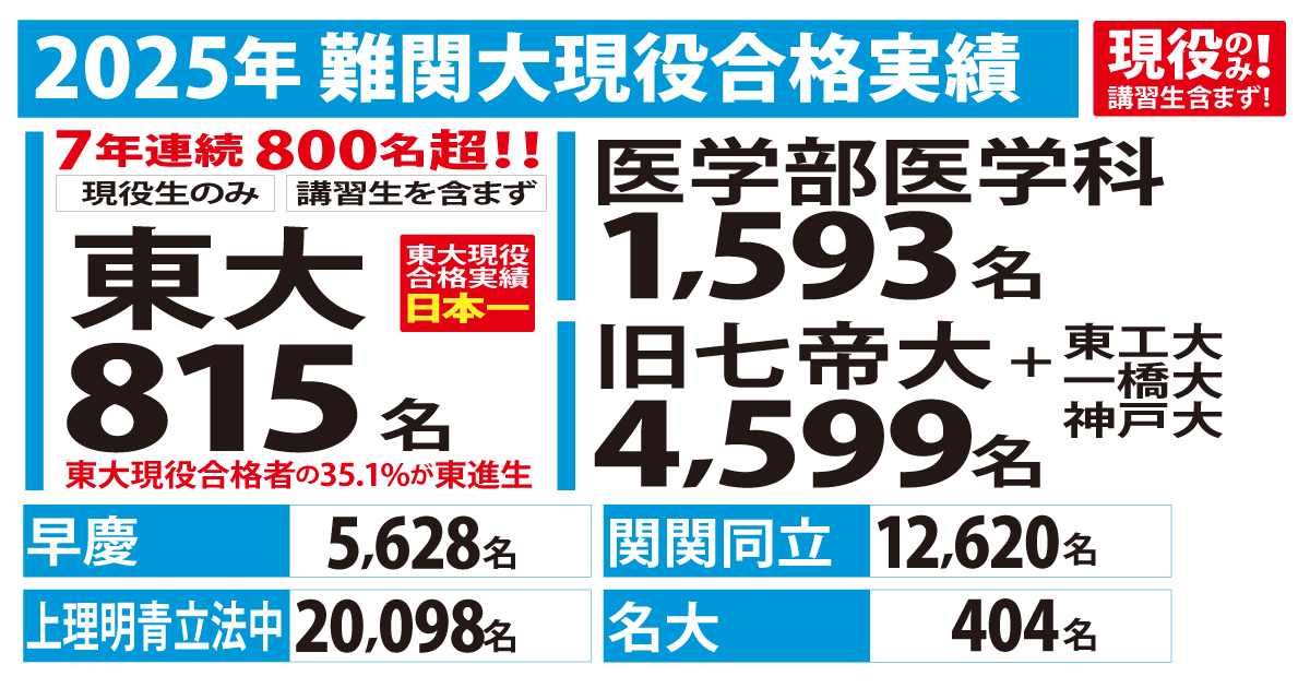 東進は、生徒の皆さんの「志」を高め、「人間力」を育むことにより、大巾学力向上と志望校合格を目指します。 2020.11.042026.02.15 私立中学1年生・2年生対象の中高一貫校講座、高校受験を目指す中学1年生・2年生・3年生対象の中学対応講座(難関・上級)、小学6年生対象の中学進学準備講座は、東進中学NETをご利用ください。 東進衛星予備校の詳しいご説明はこちらをご覧ください。